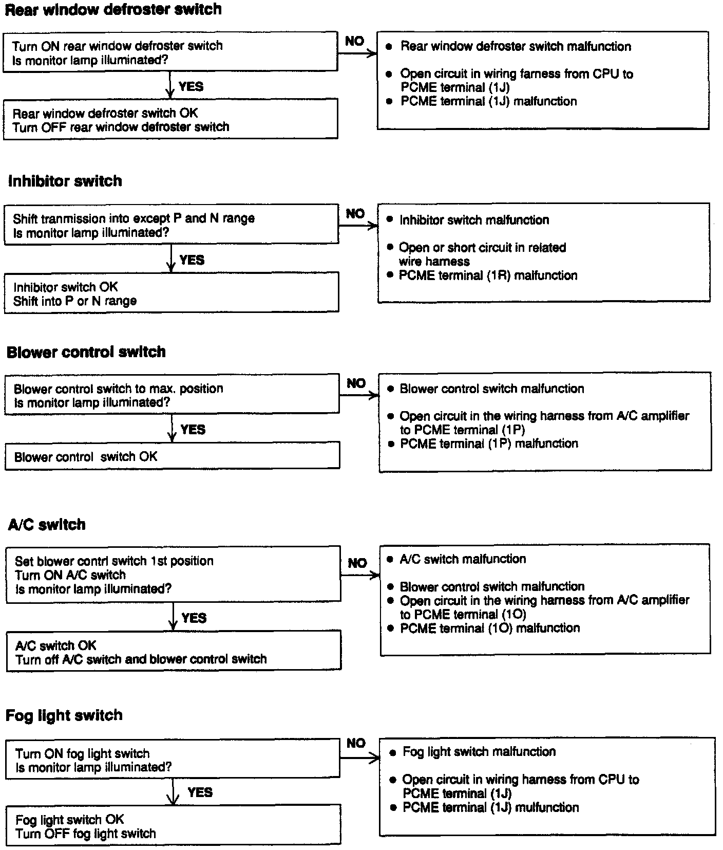 7. Check if monitor lamp illuminates when each switch is made to function as described on image chart: