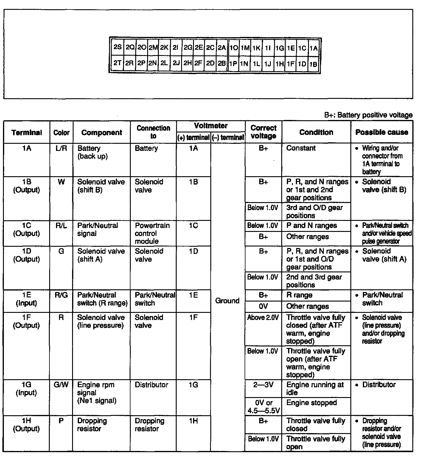 7. If any powertrain control module (transmission) terminal voltage is incorrect, check the related input or output devices and wiring. If no problem is found, replace the powertrain control module (transmission).