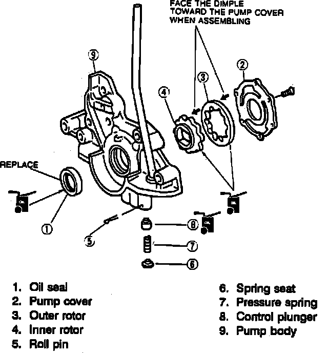 7. Assemble oil pump in reverse numbered sequence, Fig. 108. When installing seal, apply engine oil to pump body and new seal and press in seal until it is flush with front of pump body.