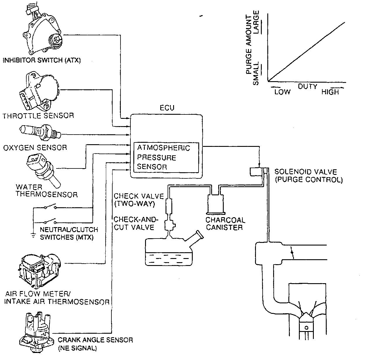 The solenoid is operated by duty signals from the ECU. The quantity of evaporative fumes introduced into the engine is controlled corresponding to engine operating conditions. Evaporative fumes are purged from the charcoal canister under these conditions: