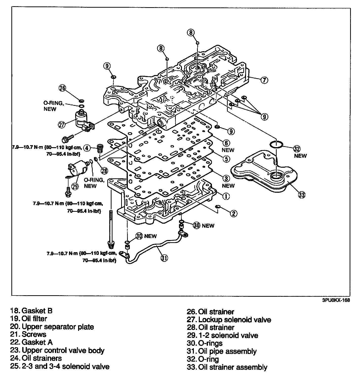 20. Install the oil strainer and solenoid valve (1-2 shift).