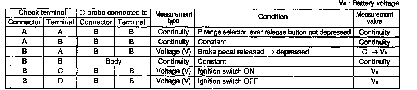 3. If not as specified, repair the wire harness and/or replace the shift-lock actuator.