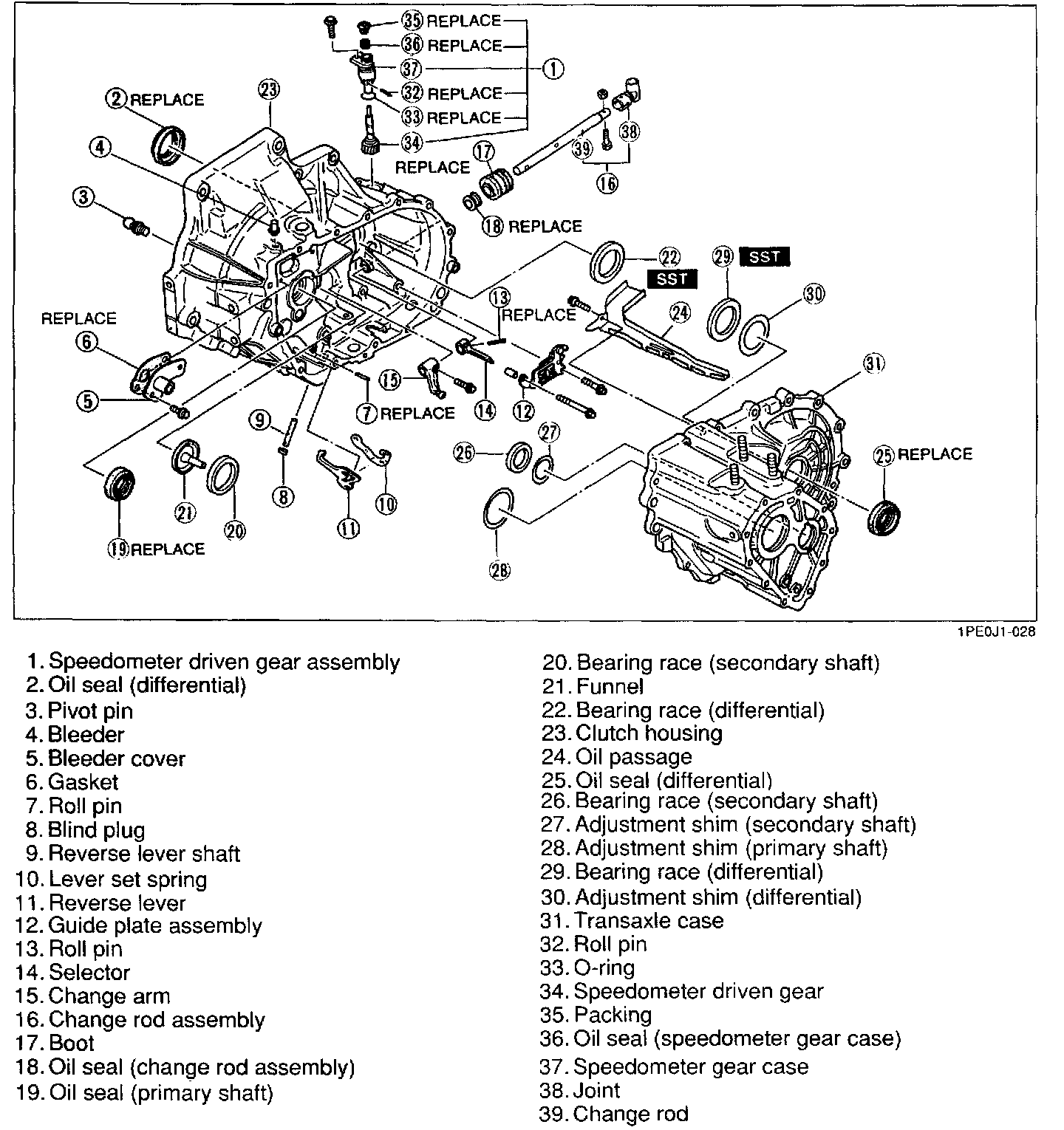 2. If the clearance exceeds the maximum, check the contact surfaces of the 1st gear, differential drive gear of the secondary shaft gear, and clutch hub assembly (1st/2nd). Replace worn and damaged parts.