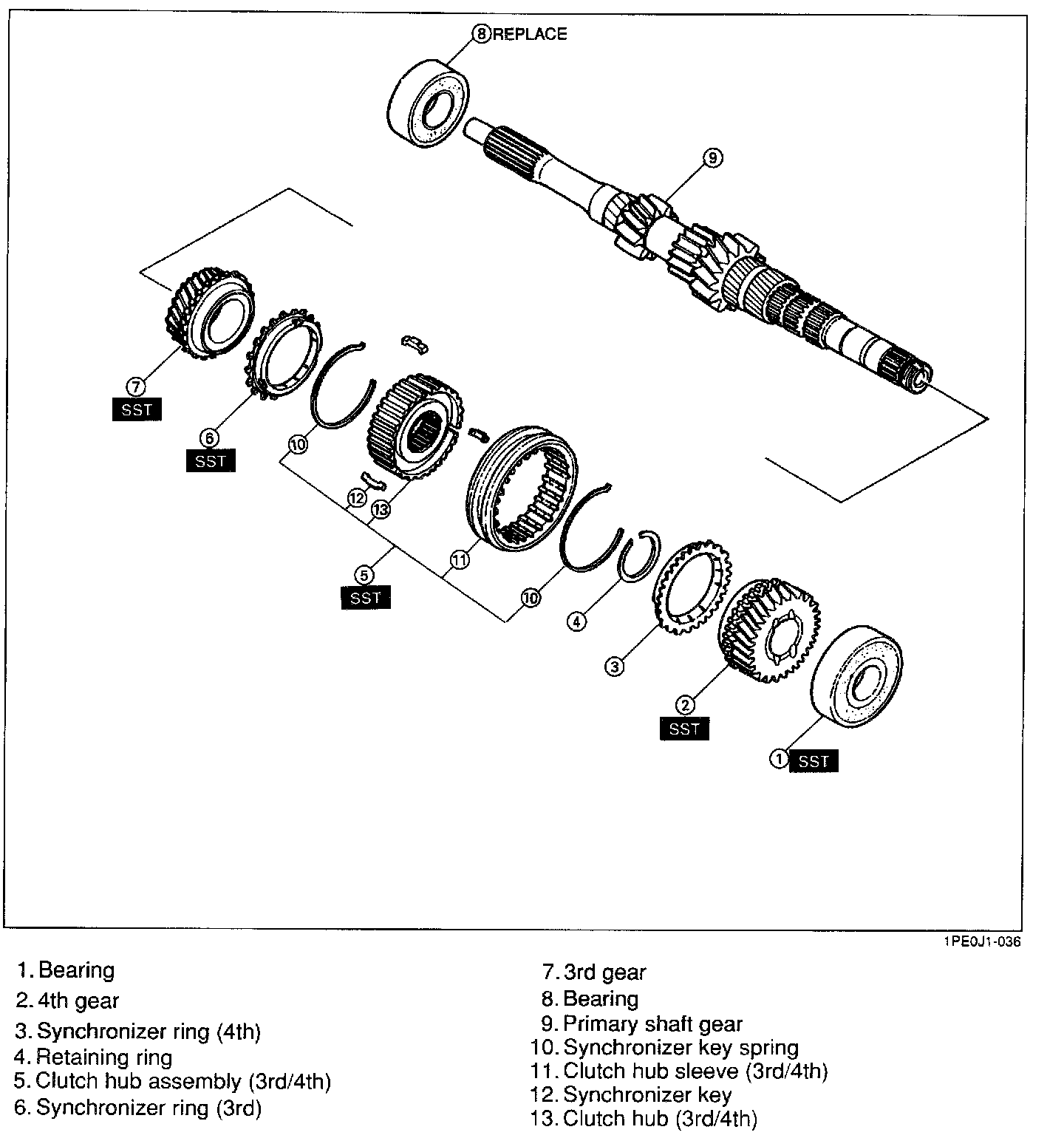 2. Remove the clutch hub assembly (3rd/4th), synchronizer ring (3rd), and 3rd gear by using the SST.