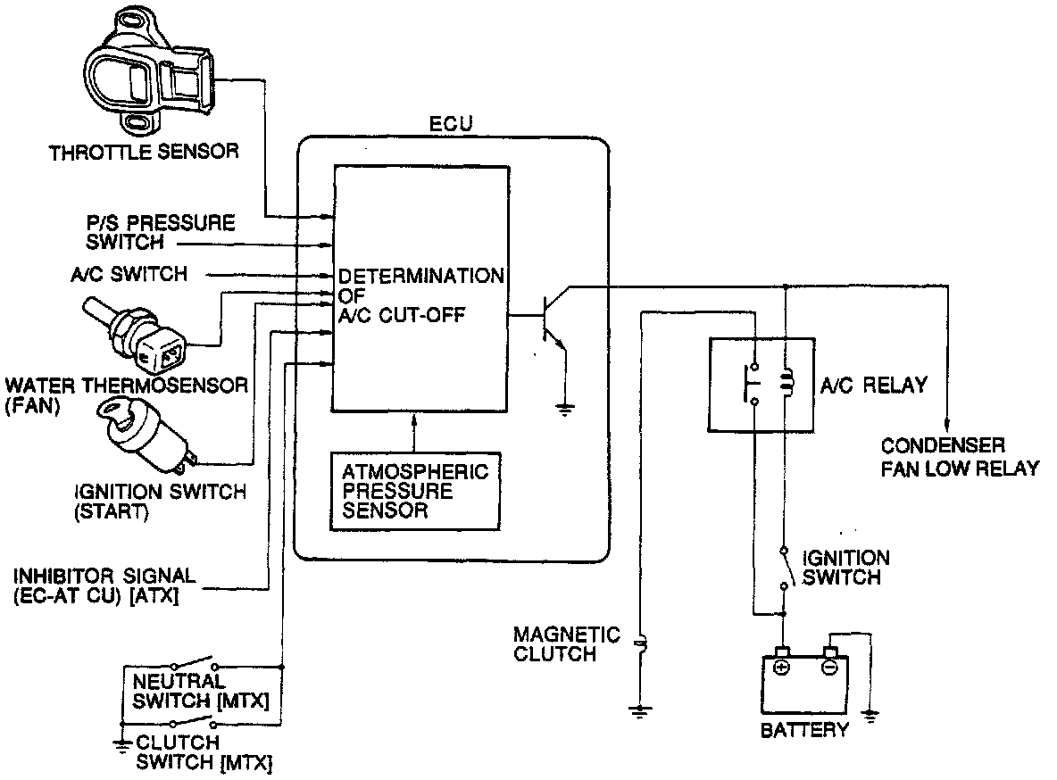 The ECU cuts A/C system operation at specified times to improve idle smoothness just after starting, improve driveability and acceleration performance, and to prevent engine overheating.