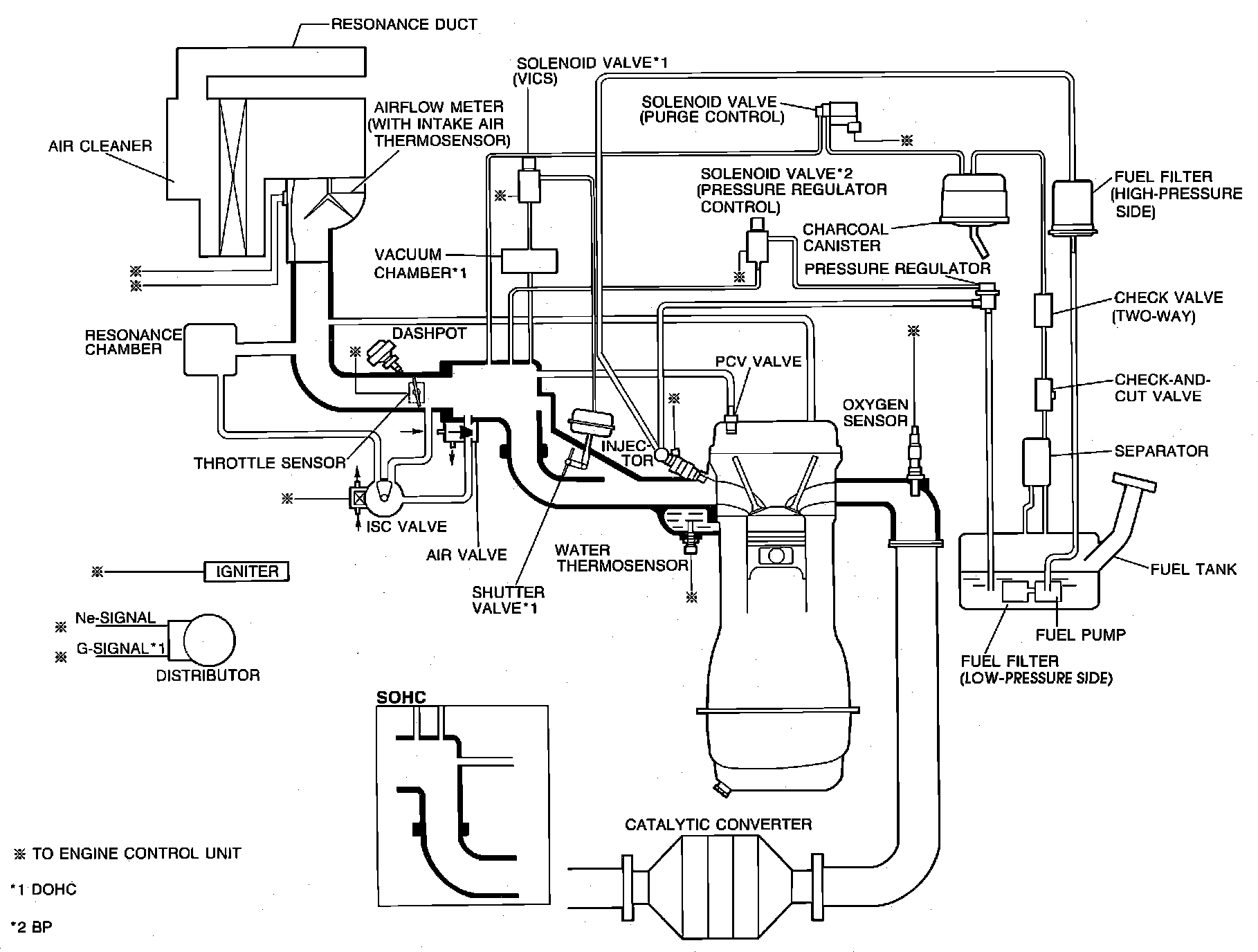 This vehicle is equipped with a 1.8 liter, SOHC (Single Overhead Camshaft) 4 cylinder gasoline engine, and a computer controlled electronic fuel injection system (referred to as EGI - Electronic Gasoline Injection). The system maintains an air/fuel mixture as close as possible to the ideal stoichiometric ratio, for all operating conditions. During normal operation, the computer monitors various engine sensors, including an exhaust gas oxygen sensor, and operates the injectors for varying lengths of time depending on the amount of fuel required. Ignition timing is also computer controlled. The computer monitors engine sensors and calculates crankshaft position, engine speed and load, to determine the correct spark timing.