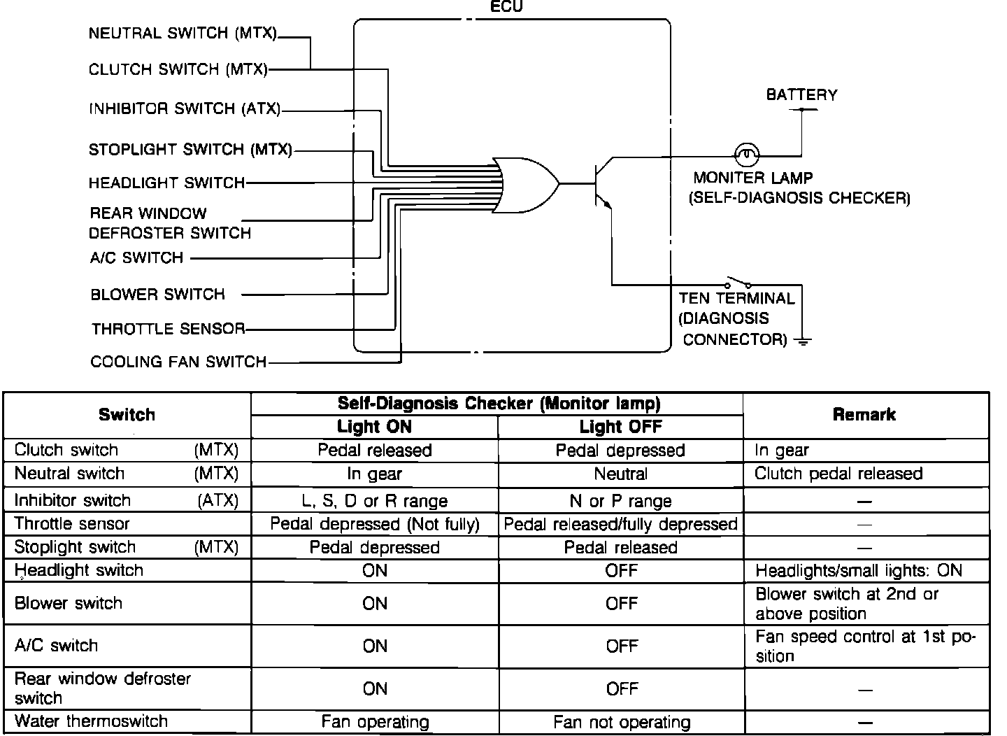 ^ The ECU Switch Monitor Function permits checking individual switches with Mazda Self-Diagnosis Checker (SST #49 H018 9A1) or a compatible aftermarket "Scan" tool.