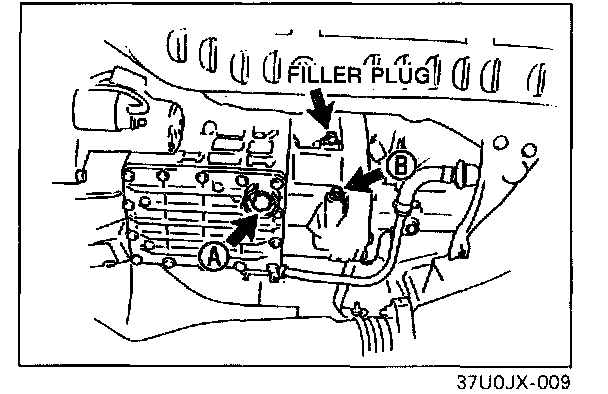 2. Remove plug A (with washer) and B, and drain the oil into a suitable container.
