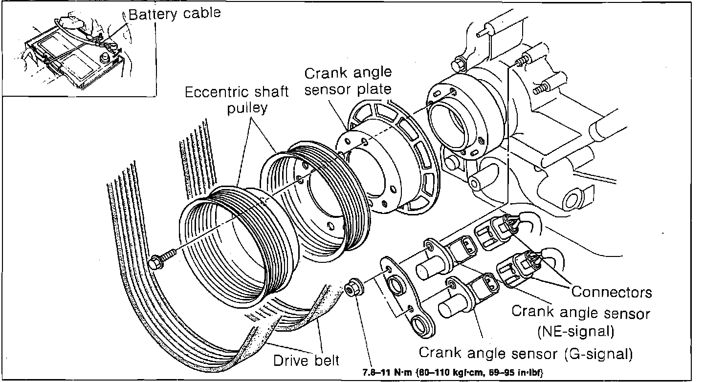 Detects eccentric shaft position at 30° intervals and front rotor position. Signals ECU with this information, which is used in calculations for functions such as ignition and injection timing.