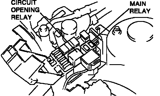 Relay normally "OFF." Turning ignition switch "ON" activates relay to supply power to PCME and control devices.