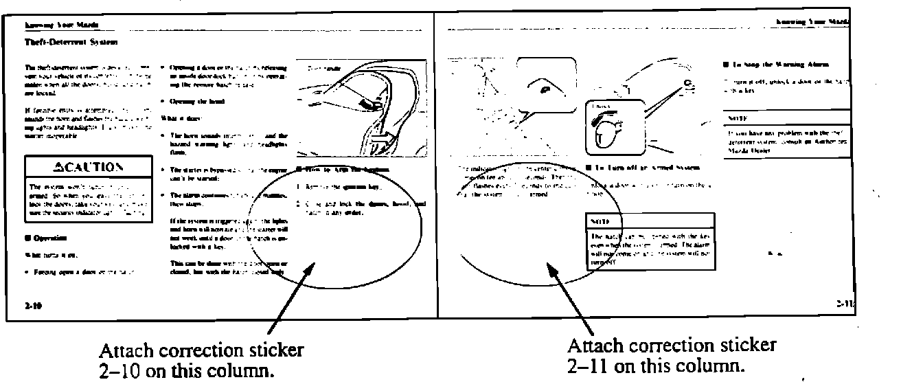 If your dealership is servicing a 1993 RX-7 that is within the applicable VIN range (see above), update the owner's manual by attaching the correction stickers on pages 2-10 and 2-11. These stickers reflect revised Theft-Deterrent