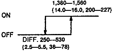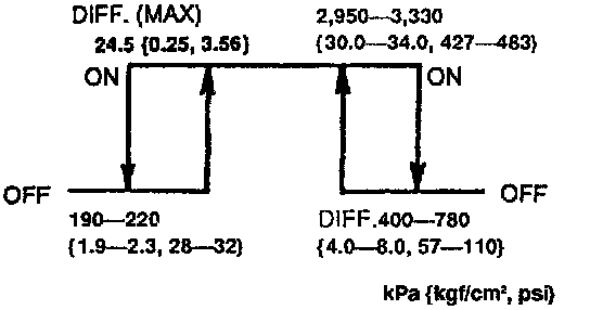 If problems occur in the refrigerant system that cause abnormally high pressure (above 2,950-3,330 kPa {30.0-34.0 kgf/cm2 427-483 psi}) or abnormally low pressure (below 190-220 kPa {1.9-2.3 kgf/cm2, 28-32 psi}), the refrigerant pressure switch will cut power to the magnetic clutch to protect the mechanical components. If the pressure recovers to within normal operating range, the power will be restored.