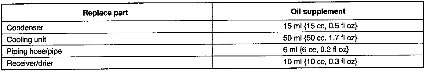 After replacing parts, add compressor oil as shown in the following table.