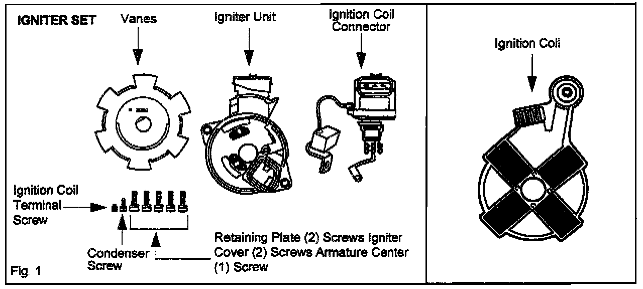 To improve the serviceability, the igniter set and the ignition coil (Fig. 1) have been newly established as components of the distributor in addition to the cap, the rotor and the gasket The igniter set includes an igniter unit, vanes, ignition coil connector and all screws (except cap screws).