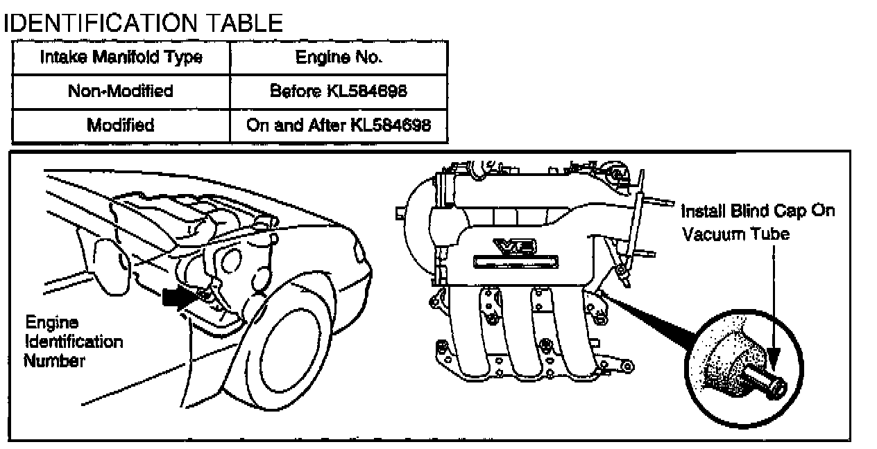 ^ Interchangeability - The modified intake manifold may be installed on 1994-95 626/MX-6 model vehicles produced prior to Engine No. KL 584698. However, a blind cap must also be installed over the vacuum pipe on the manifold. Refer to the illustration.