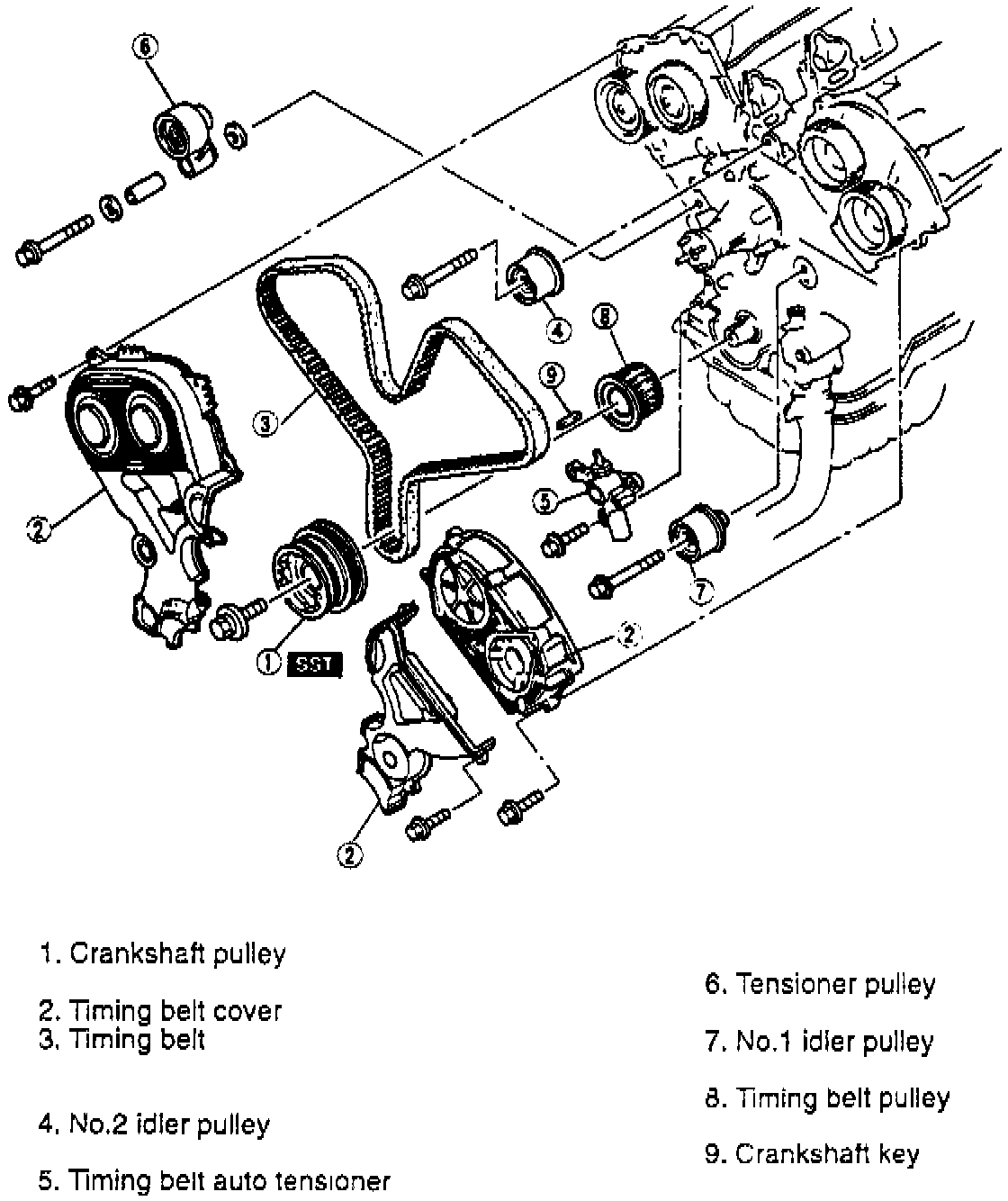 12. Remove crankshaft pulley, timing belt cover and No. 2 idler pulley, Fig. 9.