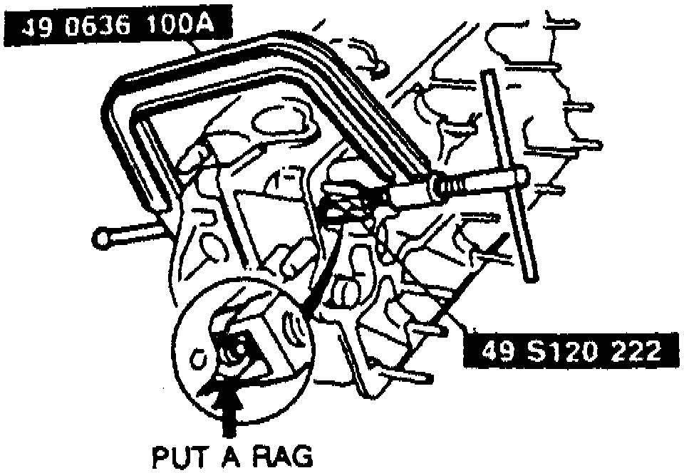 11. Holding driveplate in position with tool No. 49 E011 1A0, or equivalent, remove crankshaft pulley lockbolt.