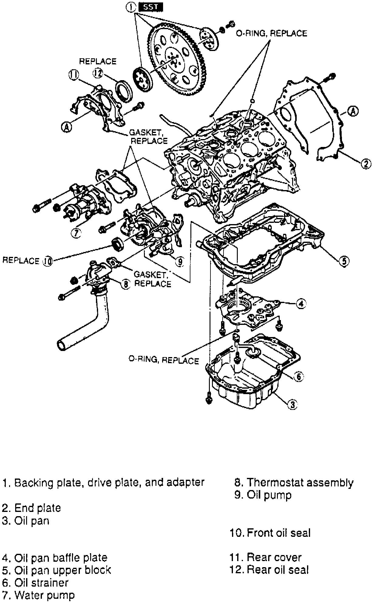 31. Remove oil pan baffle plate, oil pan upper block and oil strainer.