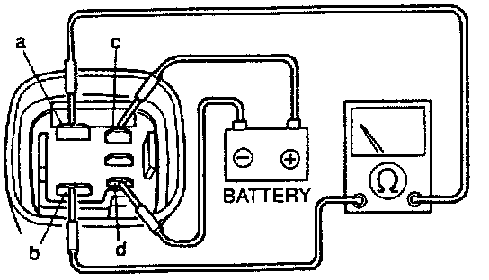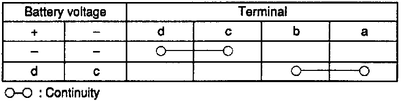 2. Connect battery voltage to terminal c and ground terminal d, and check for continuity between terminals a and b.
