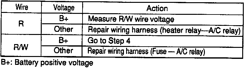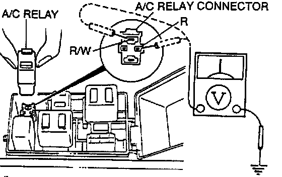 3. Measure voltage at terminal wires (R) and (R/W) of the A/C relay connector in the relay box.