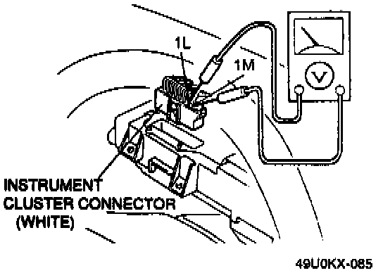 5. Measure the voltage between terminals "1L" and "1M" of the speedometer connector (harness side) with the rear wheels turning slowly.