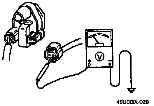 4. If there is no spark, disconnect the connector from the Ignition Coil and check for voltage at the positive (+) terminal of the connector as shown with the ignition switch turned to ON.