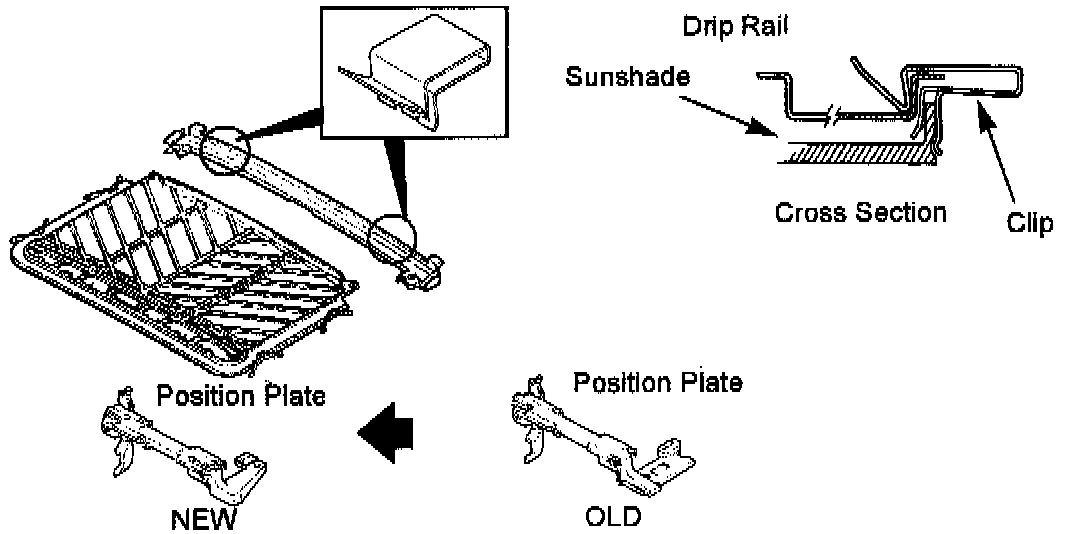 Two (2) clips must also be installed when the modified position plate is installed on a vehicle with a steel sunroof panel. These clips enable the sunshade to work properly when closing the sunroof from a fully open position.