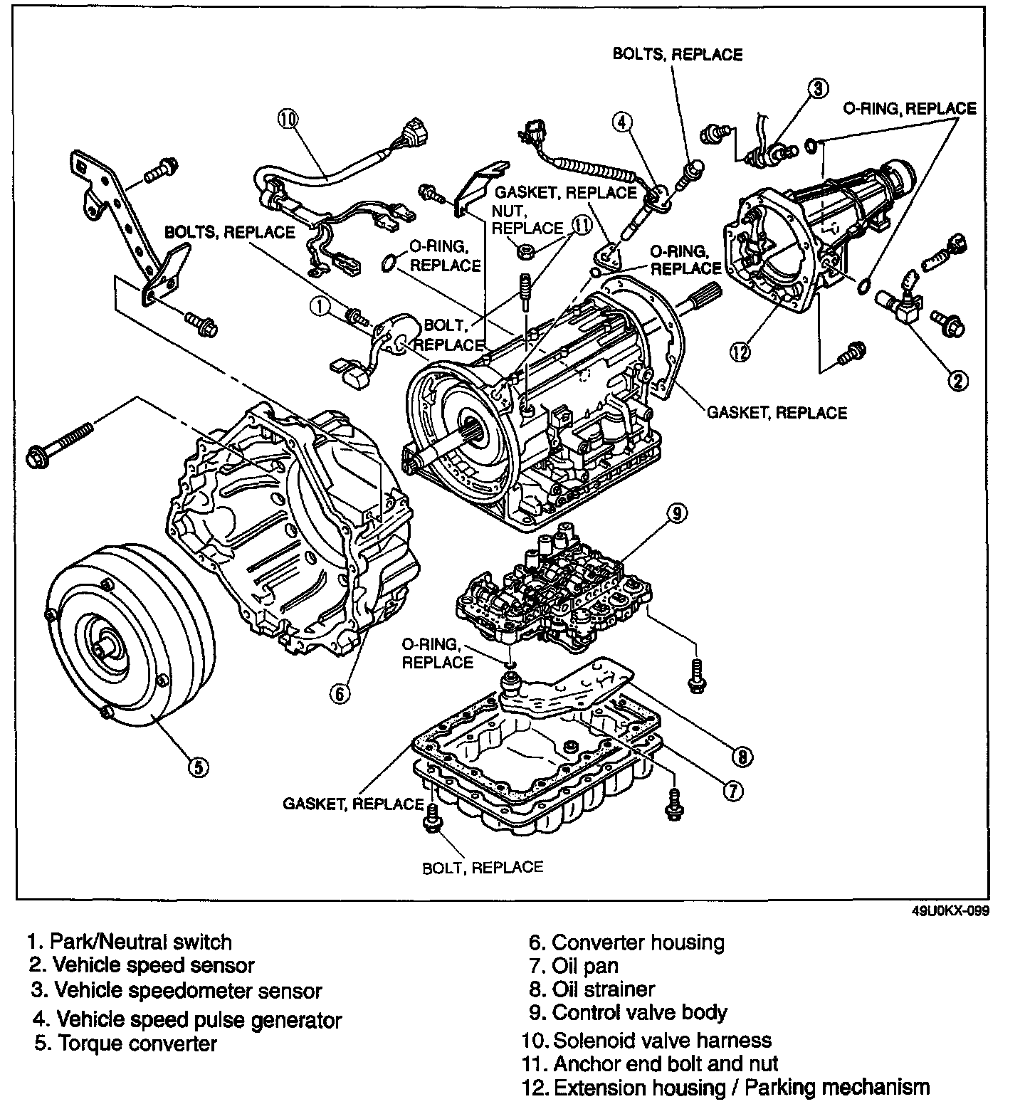 13. Remove the vehicle speed pulse generator and gasket from the transmission case.