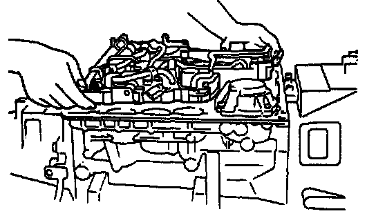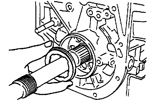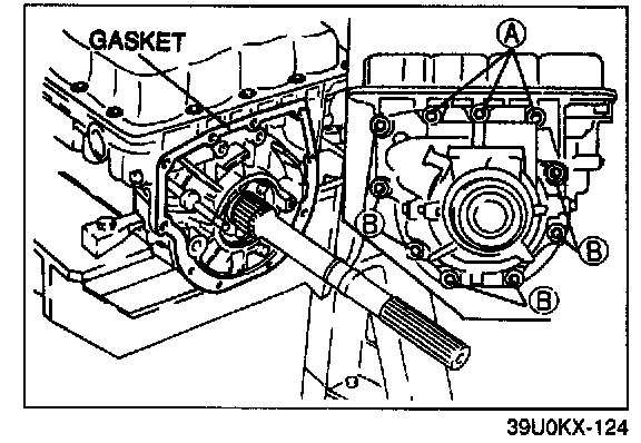 37. Slowly remove the oil pump from the transmission case by evenly sliding the weights of the SST.