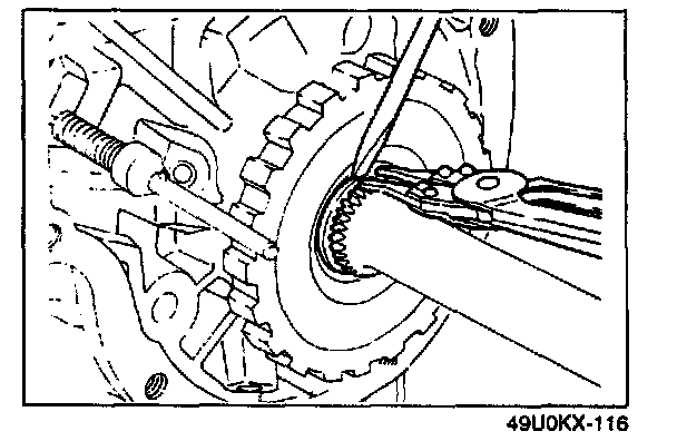 54. Push the output shaft slightly forward and remove the snap ring from the output shaft.