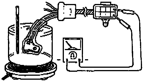 2. Place the ATF Thermosensor in water with a thermometer as shown, and heat the water gradually.