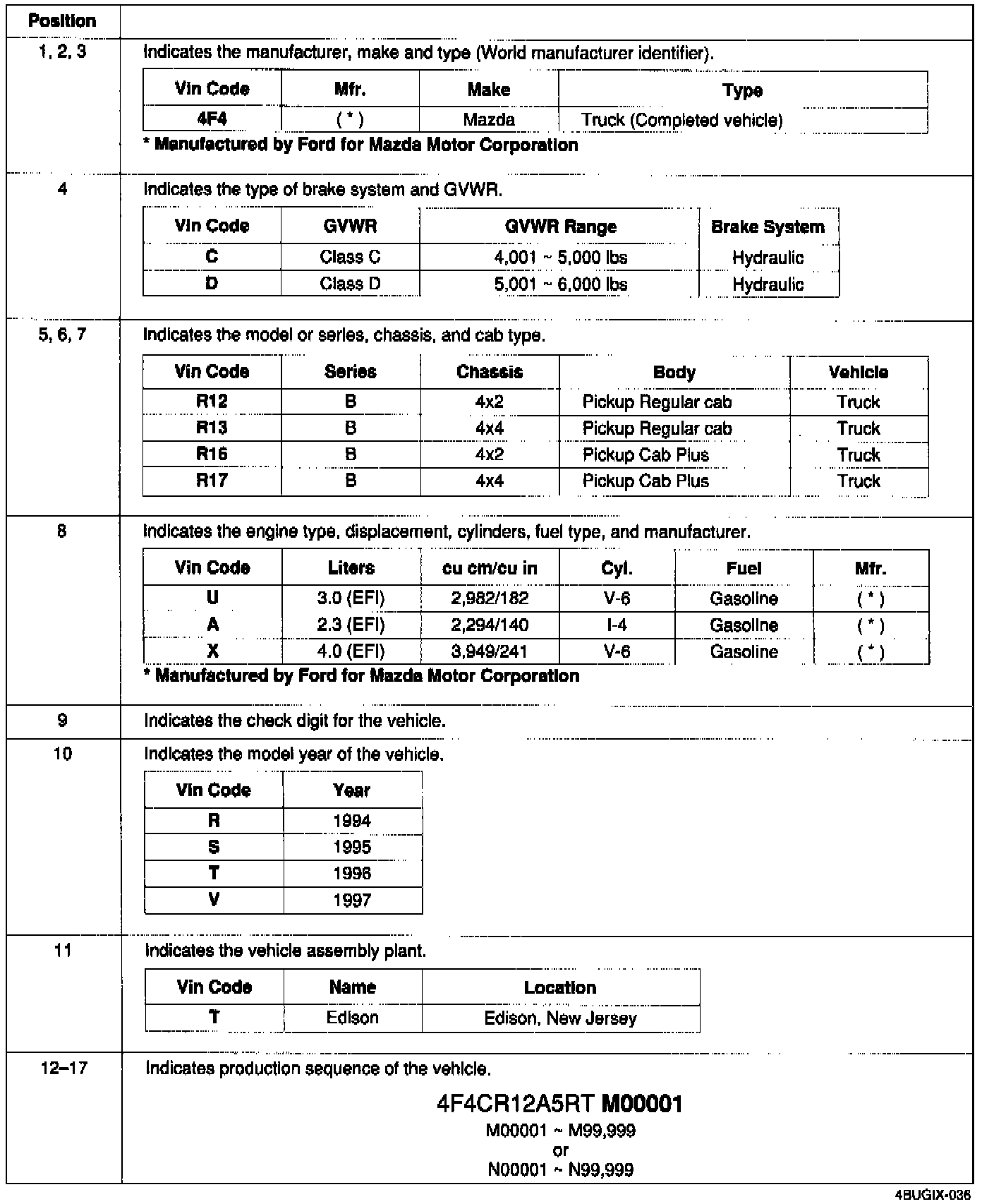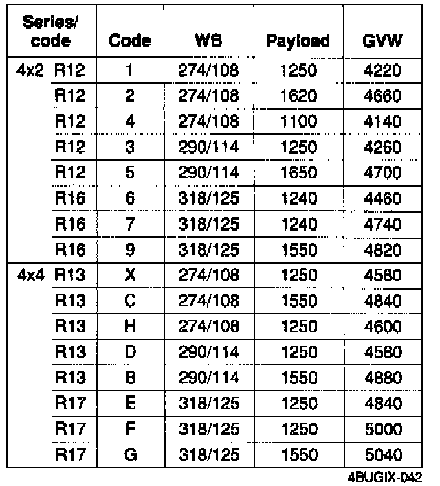The digits under WB designate the wheelbase in centimeters. The letter and three digits under Type-GVW designate the truck model within a series and the gross vehicle weight rating.