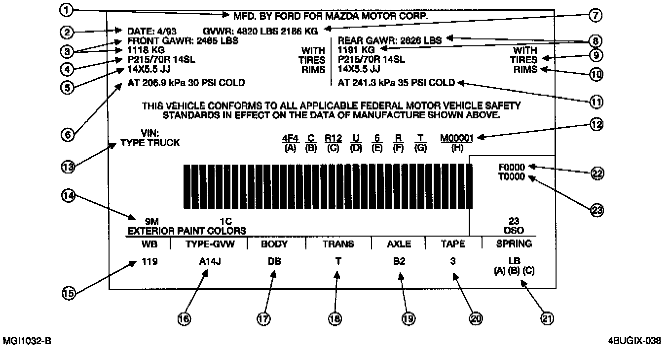 The vehicle data appears on the Safety Compliance Certification Label on the second and third lines following the identification number. The code set (two numbers, or two letters, or a number and a letter) above Color identifies the exterior paint color. The letters and/or number under Body designate the interior trim, seat and the body type. The letters and/or numbers under Tape designate the external body side tape stripe code.