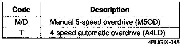 The transmission installed in the vehicle is identified under Trans by an alphabetical code. A letter and a number or two numbers under Axle identifies the rear axle ratio. The spring usage codes for the vehicle are identified under Spring.
