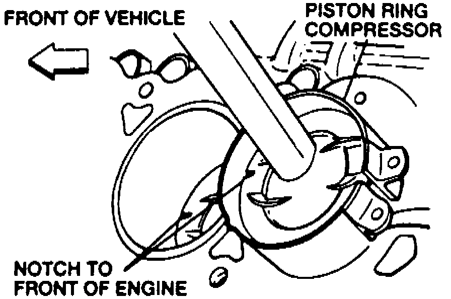 3. Install piston ring compressor on piston Fig. 19, then push piston into cylinder block with suitable hammer handle until it is slightly below top of cylinder. Guide connecting rod to avoid damaging crankshaft journal. Ensure indentation notch on top of cylinder is toward front of engine. Repeat for remaining pistons.