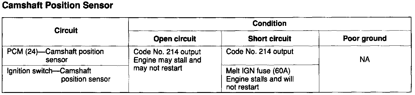- If the camshaft position sensor or circuit has an open or short, Diagnostic Trouble Code No. 214 is output.