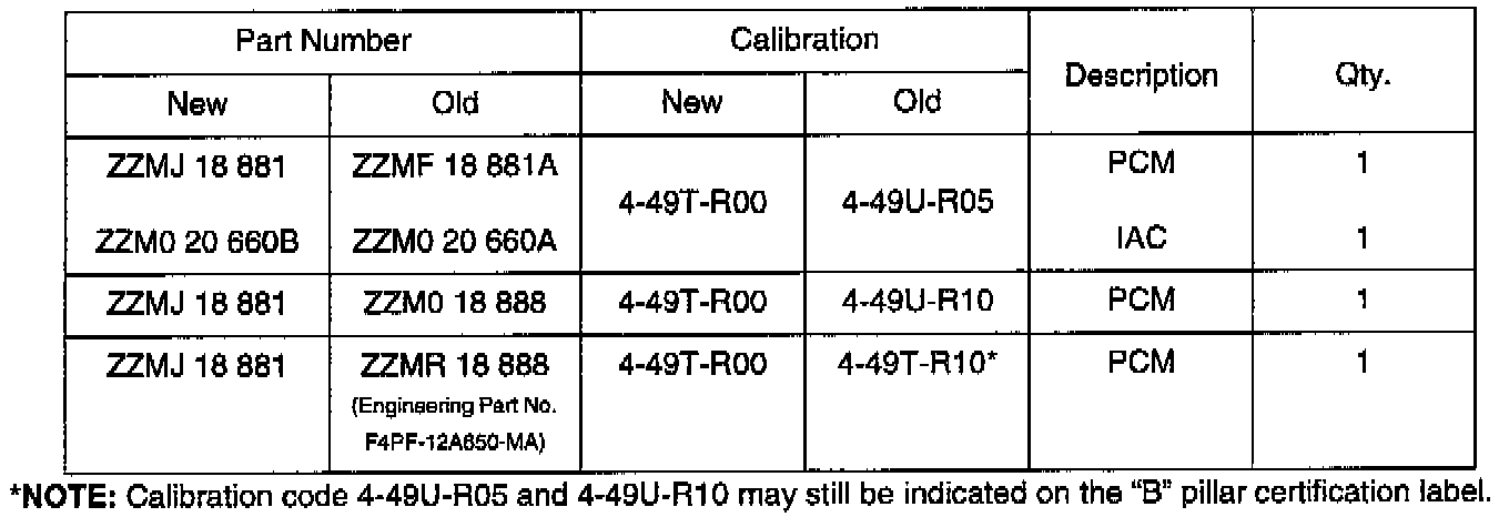 Check that the Engineering Part Number F4PF-12A650-MA is on the PCM. This number is located just below the bar code label on the PCM connector.Vehicles with this PCM have an updated calibration code (4-49T-R10) as a result of repairs described in S/B Cat. F # 007/95. Proceed to step 3 with these vehicles as well.