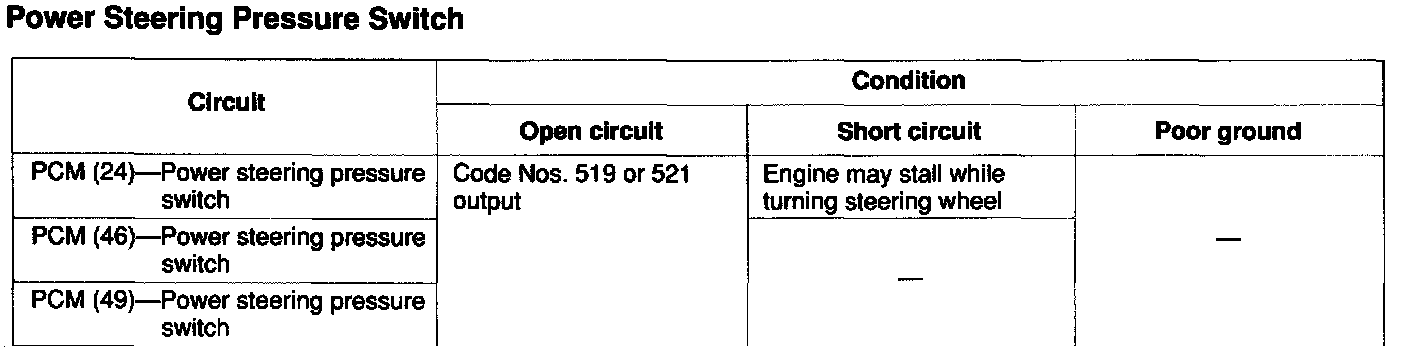 If the power steering pressure switch or circuit has an open or short, Diagnostic Trouble Code No. 519 or 521 is output.