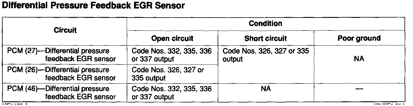 If the differential pressure feedback EGR sensor or circuit has an open or short, Diagnostic Trouble Code No. 326, 327, 332, 335, 336 or 337 is output.