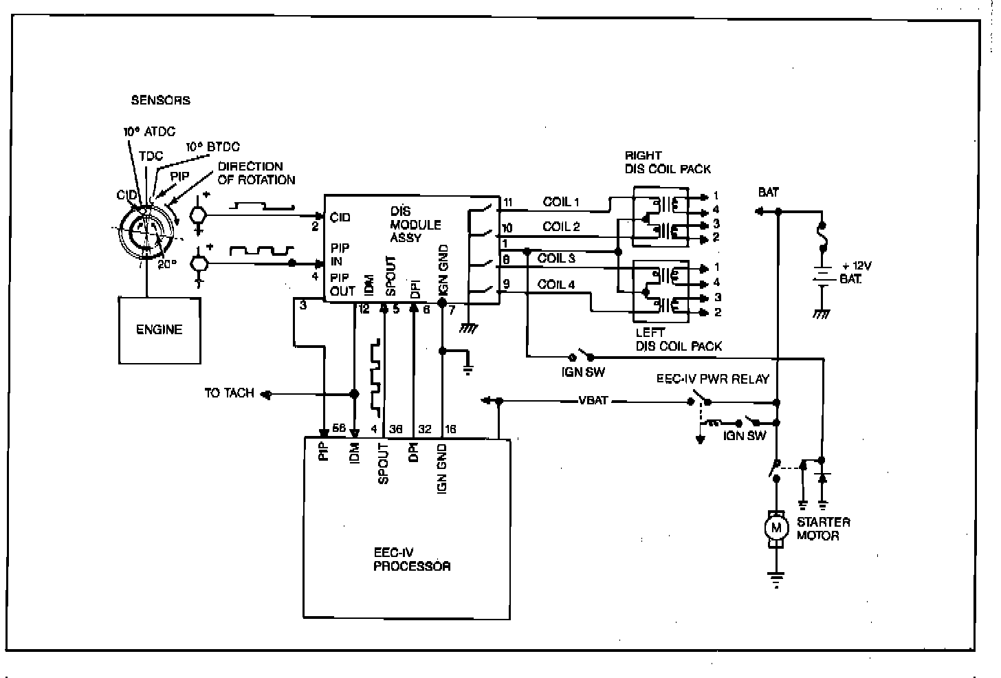 The EI eliminates the need for a distributor by using multiple ignition coils. Each coil fires two spark plugs at the same time. The coils are paired so that as one fires during the compression cycle the other fires during the exhaust stroke. The next time the coil is fired, the plug that fired on the exhaust stroke will fire on the compression stroke and the one that was on the compression stroke will fire on the exhaust stroke (the spark in the exhaust cylinder is wasted but little of the coil energy is lost).