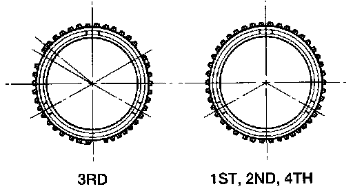 Note: The 3rd gear synchronizer ring has three teeth cut out 120° apart from each other. Directly adjacent to one side of the missing teeth two teeth have been bridged together.