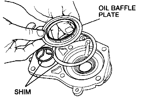 7. Position the bearing shim and baffle plate into the front cover (install the shim with the groove showing).