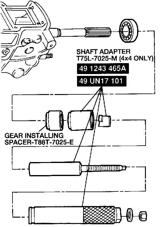 Install the bearing using the SST, Shaft Adapter T75L- 7025-M (4x4 only), Gear Installing Spacer 188T-7025-E, or equivalents.