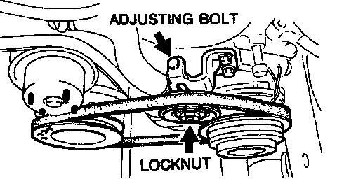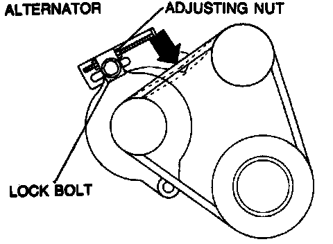 If necessary, loosen the alternator bolts and adjust the belt deflection by turning the adjusting nut.