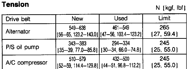 2. Check the drive belt deflection by applying moderate pressure [98 Newton only, NOT N.m] { 10 kgf, 22 Ibf } midway between the pulleys.