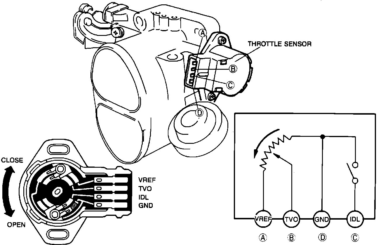 The Throttle Sensor is a potentiometer attached to the throttle body and splined to the throttle shaft. The potentiometer rotates with the shaft as the throttle opens and closes. Varying potentiometer resistance alters the reference voltage supplied by the ECU, allowing it to read throttle valve opening angle. ECU reference voltage is approximately 0.3V at idle and 4.0V at wide open throttle.
