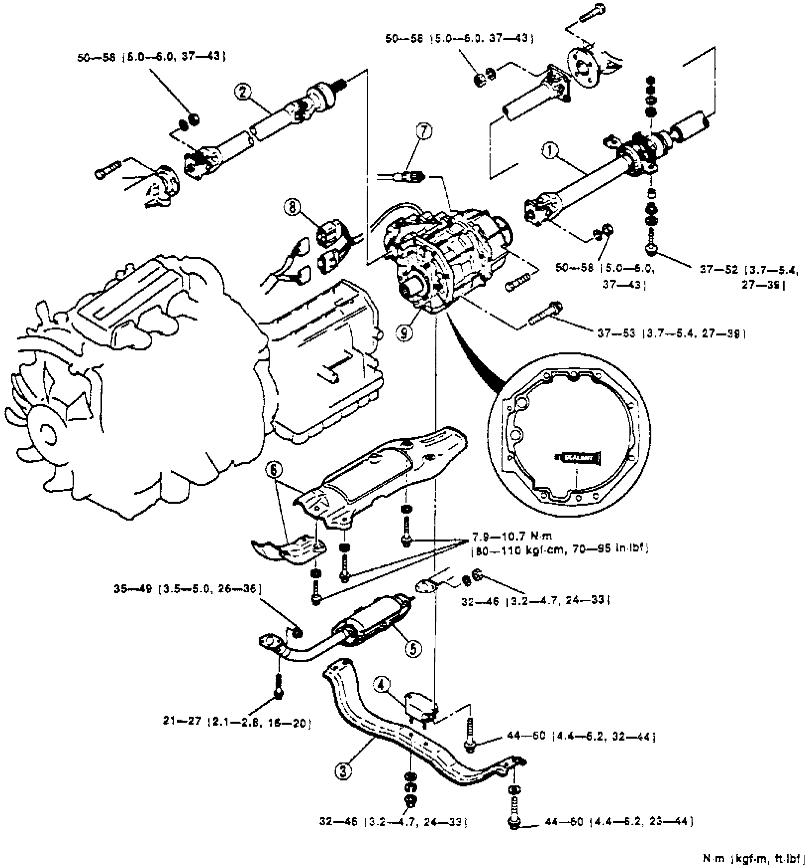 1. Disconnect battery ground cable, then raise and support vehicle and drain transfer case oil.2. Disconnect front and rear propeller shaft as outlined under "All Wheel Drive.