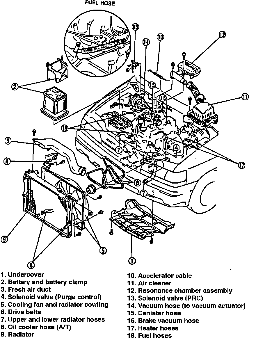 16. Remove heater hoses and fuel hoses.