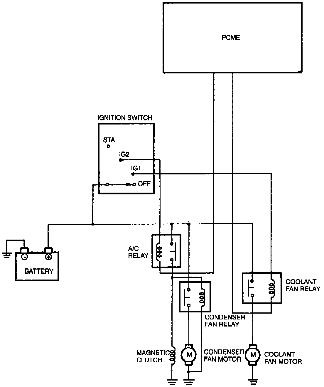 The powertrain control module engine (PCME) controls the (radiator) coolant fan and the (A/C) condenser fan to provide more efficient fan control. This improves the performance reliability and stability during idling of an engine.