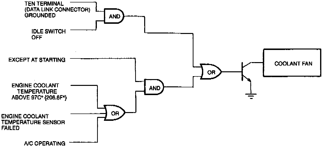 The coolant fan system is OK if it starts to operate with the data link connector TEN terminal grounded and the accelerator pedal is depressed (Ignition switch ON).